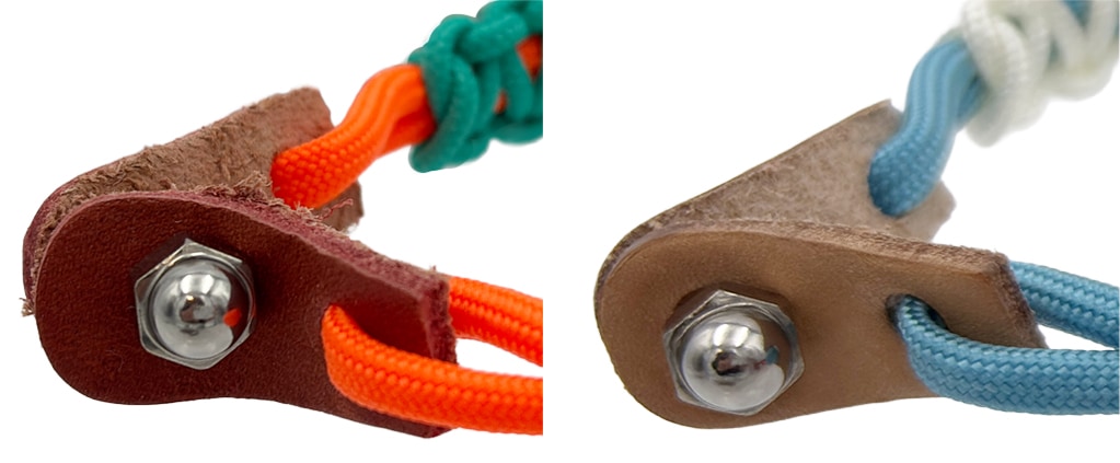 軸心は4mmのパラコード、その周りの編部は2.4mmのタクティカルコード、ストラップ先端はパラコードと相性の良い本革で作られています。