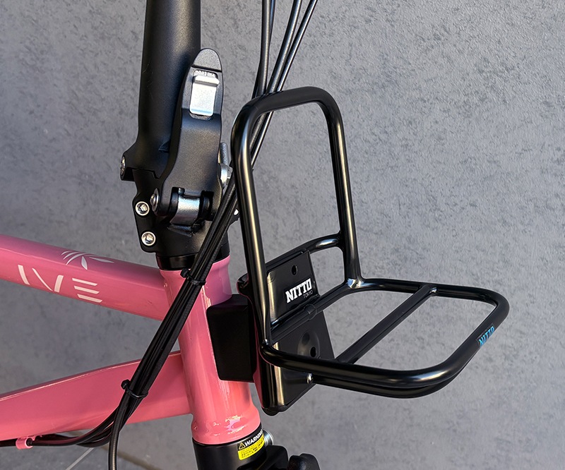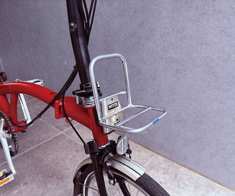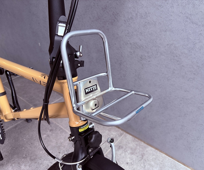 ミズタニ自転車別注「NITTO」製、ブロンプトンの樹脂製フロントキャリアブロックに装着してご使用いただける小さめのフロントキャリアです。