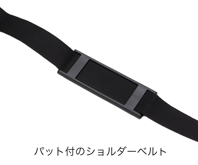 付属のショルダーベルトはコンパクトさと持ち運びやすさのバランスを考えて38mm巾のベルトを採用、肩への食い込みを減らすためのパッド付きです。