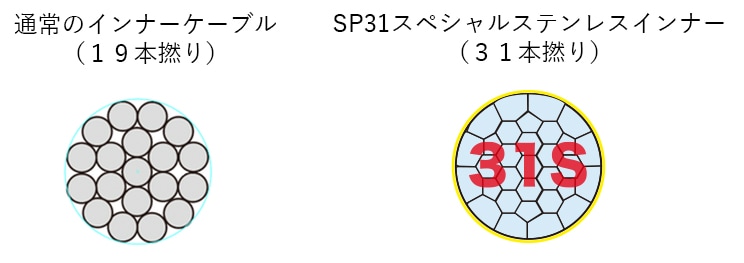 インナーケーブルに使われているSP31スペシャルステンレスケーブルは、一般的な19本の素線ではなく、31本の太さの異なる素線を高密度でより合わせていて、しなやかで柔軟性があります。